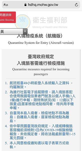 這幾年新冠疫情肆虐,讓人們的生活起了許多變化,因應疫情的隔離政策,沒辦法像以前一樣,自由進出各個國家旅遊,第一次回國隔離,避開過年的人潮,提早回來隔離,回來之前有找了一下防疫旅館的資訊,看到這家旅館房間內的工業風設計,有窗房的窗外可以看到熟悉的河堤、彩虹橋,離饒河夜市近(心想叫外送時選項多),網路的評價也都不錯,餐點好像也不錯,飯店的臉書貼文,偶有貼心的內容,感覺是家有溫度的飯店,所以在回來前就訂好有窗標準房2500元/天*15天(回來的當天不算,隔天開始算第一天,所以隔離14天,需要訂15天的住宿),室內坪數4點多坪,填好刷卡單付訂金3成,印出訂房確認書(到機場check in時需要看),回來前先填好入境檢疫系統 https://hdhq.mohw.gov.tw/Default1 如下,填好後將最後的資料截圖,入境時提供檢查