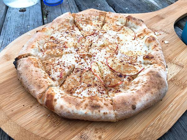 蜂蜜蘋果肉桂披薩260元~我們想說點一個鹹的當正餐,再點一個甜的當甜點,請店家兩個分開時間出爐,這道蜂蜜蘋果肉桂送上桌時,肉桂好香,原本以為會像蘋果派,但不是,吃起來甜度適中,並不會很甜 ,還不錯